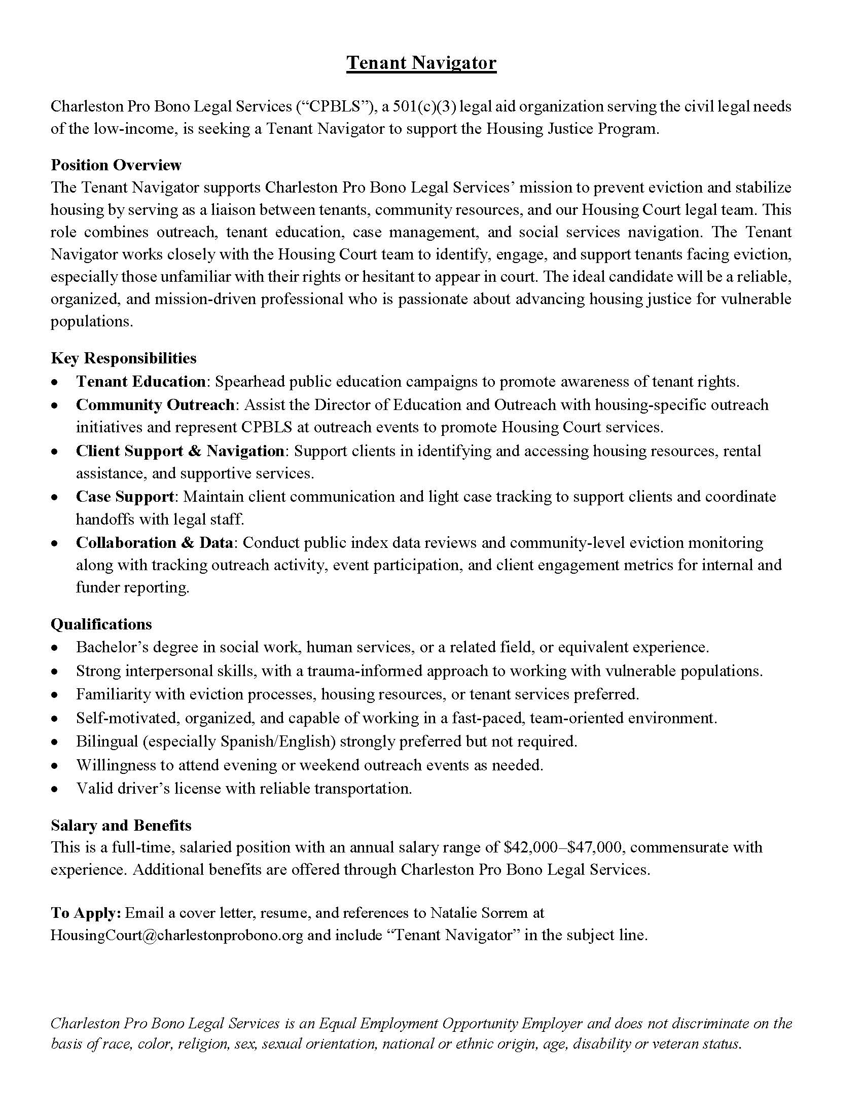 At Charleston Pro Bono Legal Services, we are dedicated to providing no-cost civil legal aid to those who need it most. By joining our team, you’ll be part of a passionate group working to create meaningful change in our community. Explore our current opportunities and take the next step in your public interest career today!